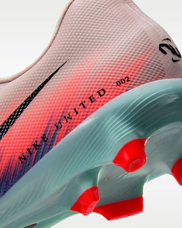 Бутси, створені для того, щоб дати вам і таким гравцям, як Лорен Джеймс і Сальма Параллуело, неймовірний приріст прискорення, вони оснащені поліпшеною вставкою Air Zoom у п'яті й хвилеподібним малюнком протектора. Колекція Nike United присвячена неймовірно швидким спортсменкам, таким як Лорен Джеймс і Сальма Параллуело. Nike використали кольорові акценти, щоб показати, як вони втілюють свої амбіції в неймовірний блиск. Вставка Air Zoom у п'яті вбудована в пластину протектора, а хвилеподібний малюнок шипів у вигляді шевронів допомагає вам чіплятися за землю, коли це найбільш необхідно. Верхня частина виконана з матеріалу NikeSkin з вбудованими шевронами, що допомагає контролювати м'яч і дійсно створює відчуття гри босоніж. Nike модернізували еластичну сітку порівняно з попереднім поколінням, замінивши її на трикотаж, що адаптується, який забезпечує гнучкість, підтримку та наближає вас до м'яча. Для використання на натуральних і синтетичних покриттях.