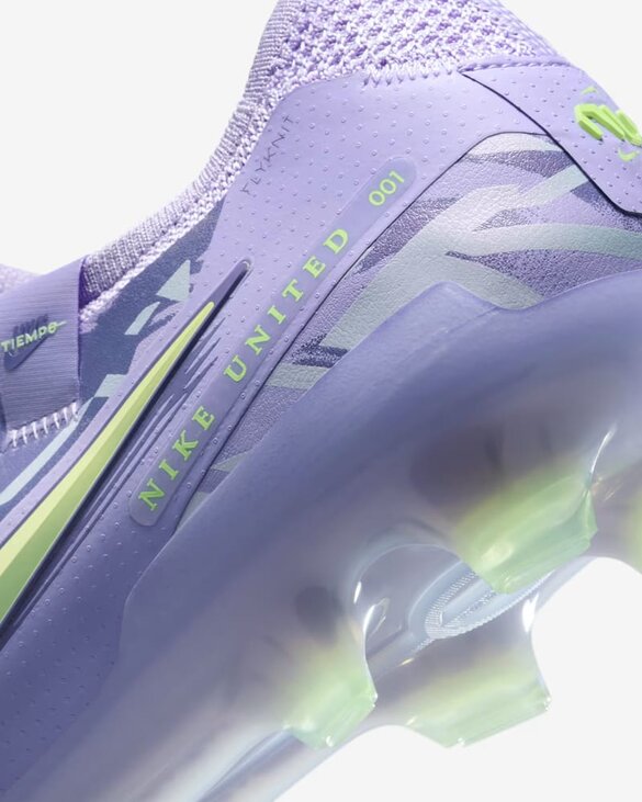 Змусьте світ звернути на себе увагу за допомогою Nike United Tiempo Legend 10 Elite. Натхненні такими спортсменками, як Наомі Гірма і Патрісія Гіхарро, дизайнери використовували яскраві кольори та інноваційну графіку, що втілює наполегливість і амбіції, необхідні для досягнення вершини. Бачите ці мікроточки на верху? Вони збільшують зони дотику для ударів, дриблінгу і передач. Вони створюють більш елегантний вигляд, прибираючи додаткову амортизацію. Більш того, вони не жертвують контролем м'яча, який так цінний на полі. У цій моделі зменшили кількість піноматеріалів відносно Tiempo 9, щоб ваша нога могла бути ще ближче до м'яча, коли він у вас під контролем. Пластина з шипами в п'яті забезпечує оптимальне зчеплення і стійкість при гальмуванні і зміні напрямку руху, ідеально підходящих для будь-яких умов. Штучна шкіра FlyTouch Plus неймовірно м'яка. Вона дозволяє матеріалу приймати форму стопи, забезпечуючи комфорт без надмірного розтягування матеріалу. Технологія Flyknit в області щиколотки забезпечує відчуття впевненості. Для використання на злегка вологих полях з короткою травою.